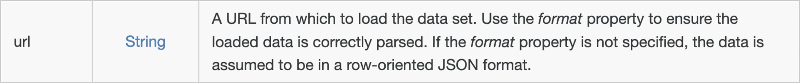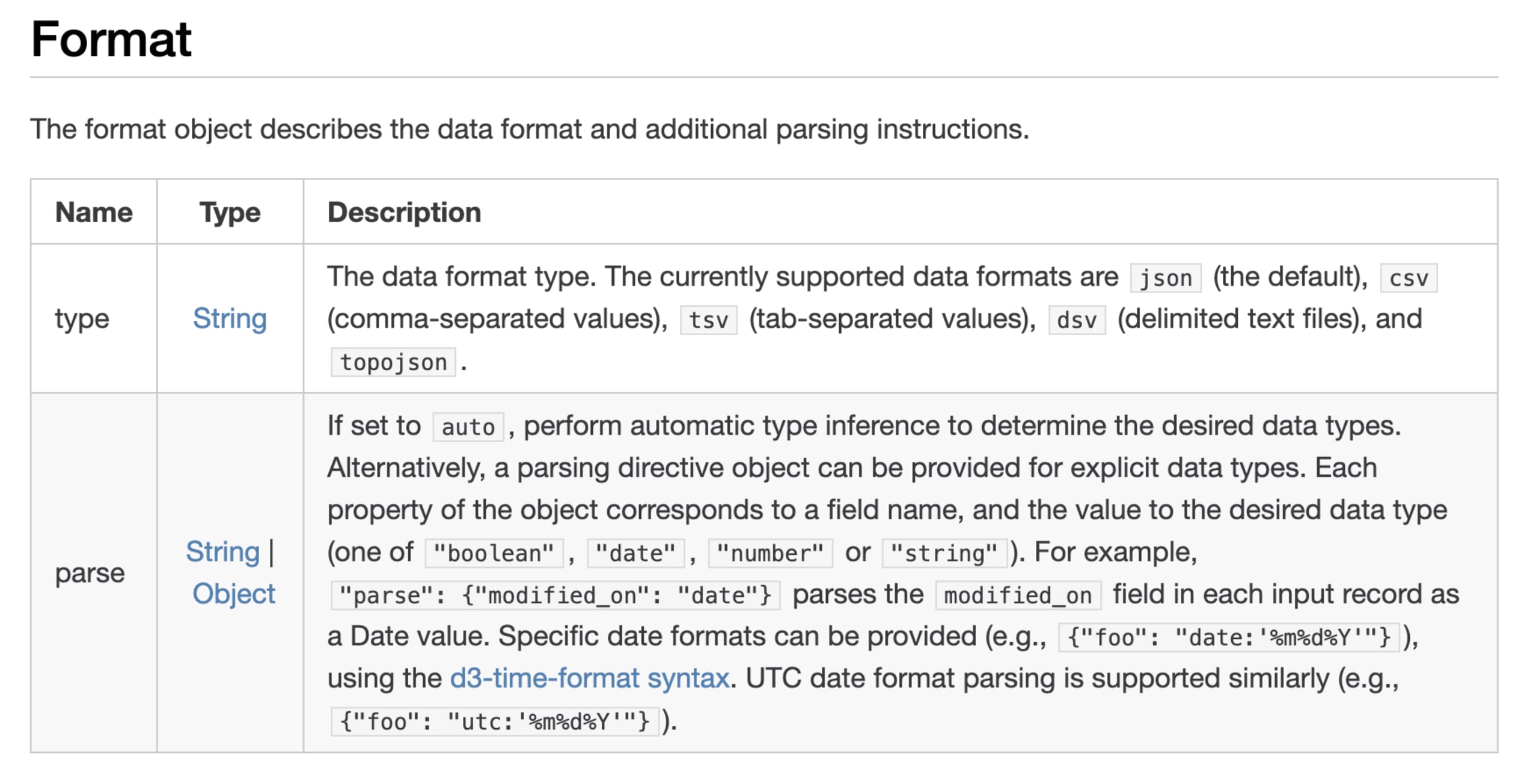 However, the output was still empty. Going back to the Vega documentation, we can notice that the file is parsed as JSON by default. The Format section shows that you can specify other input file types as well: