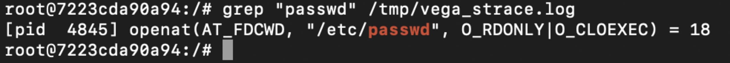 Since Vega diagrams follow a strict structure and we couldn’t easily inspect the output, it wasn’t clear whether the file was actually being read. To confirm that, we placed the input inside Kroki’s container and used strace to watch for openat syscalls on /etc/passwd:
