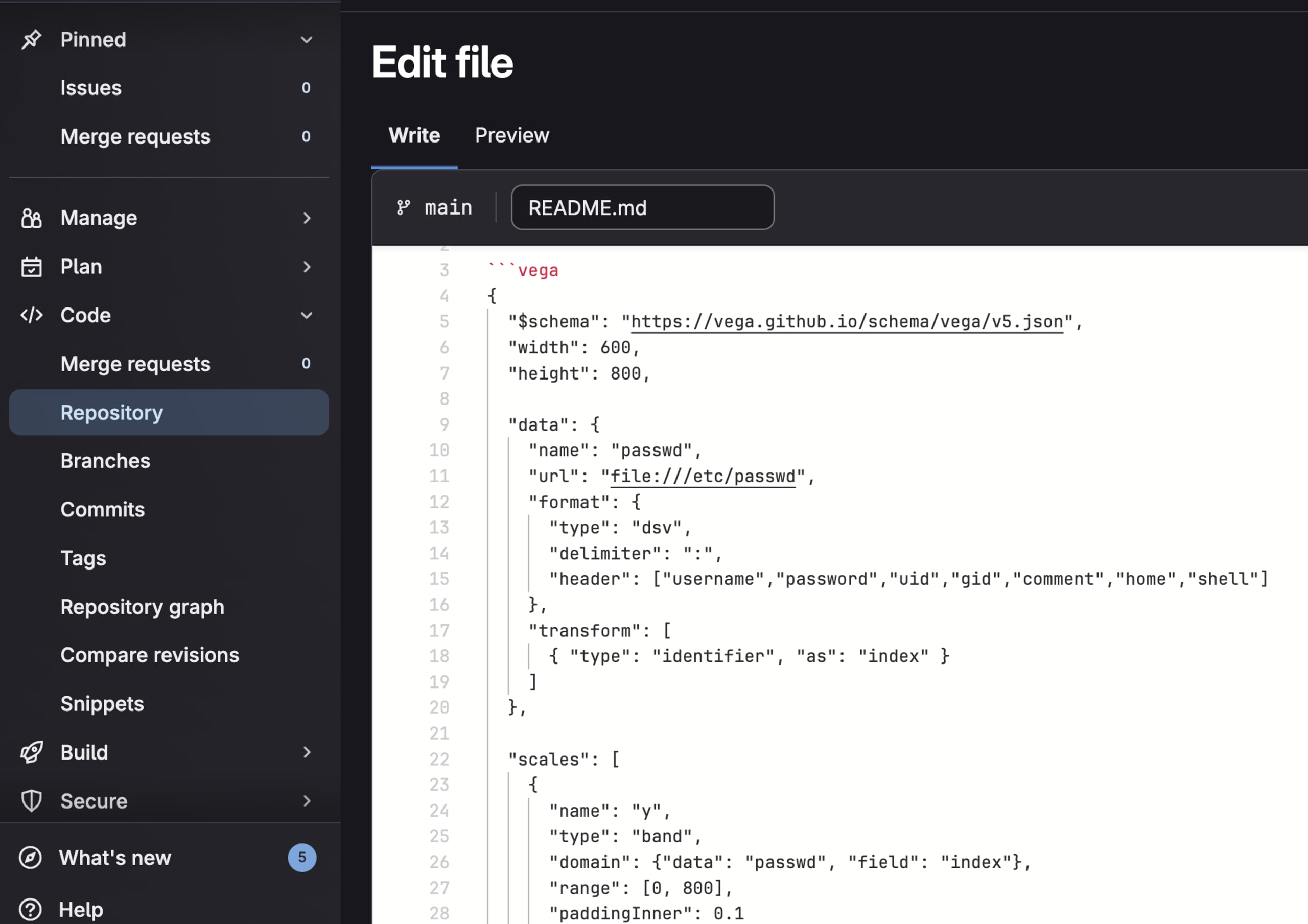After committing the file, we can observe that the diagram was rendered and the /etc/passwd file shows up inside the Vega diagram: