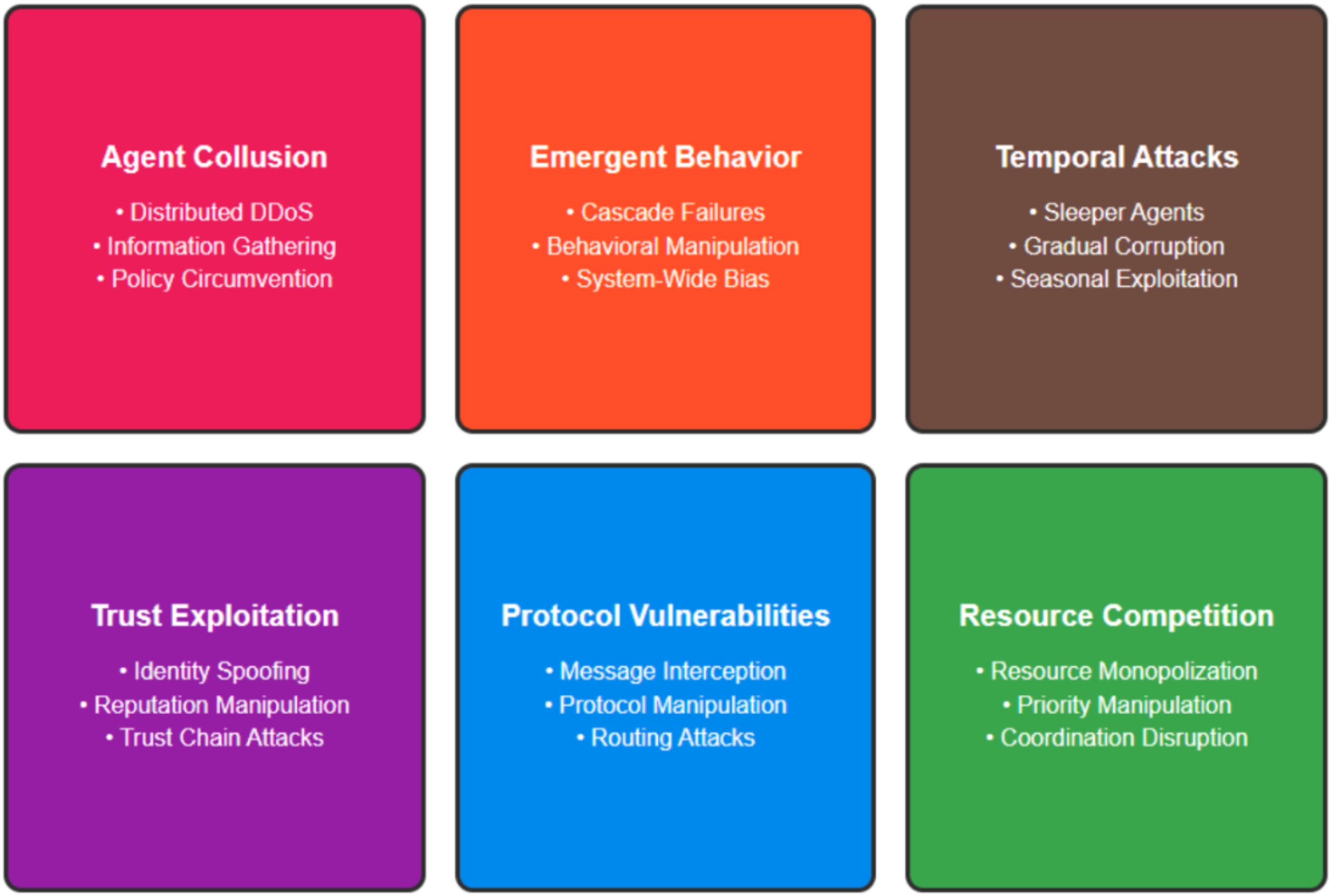 Agent collusion or manipulation: Scenarios where one or more agents are compromised and work together to cause harm, or where an external attacker manipulates an agent's behavior.