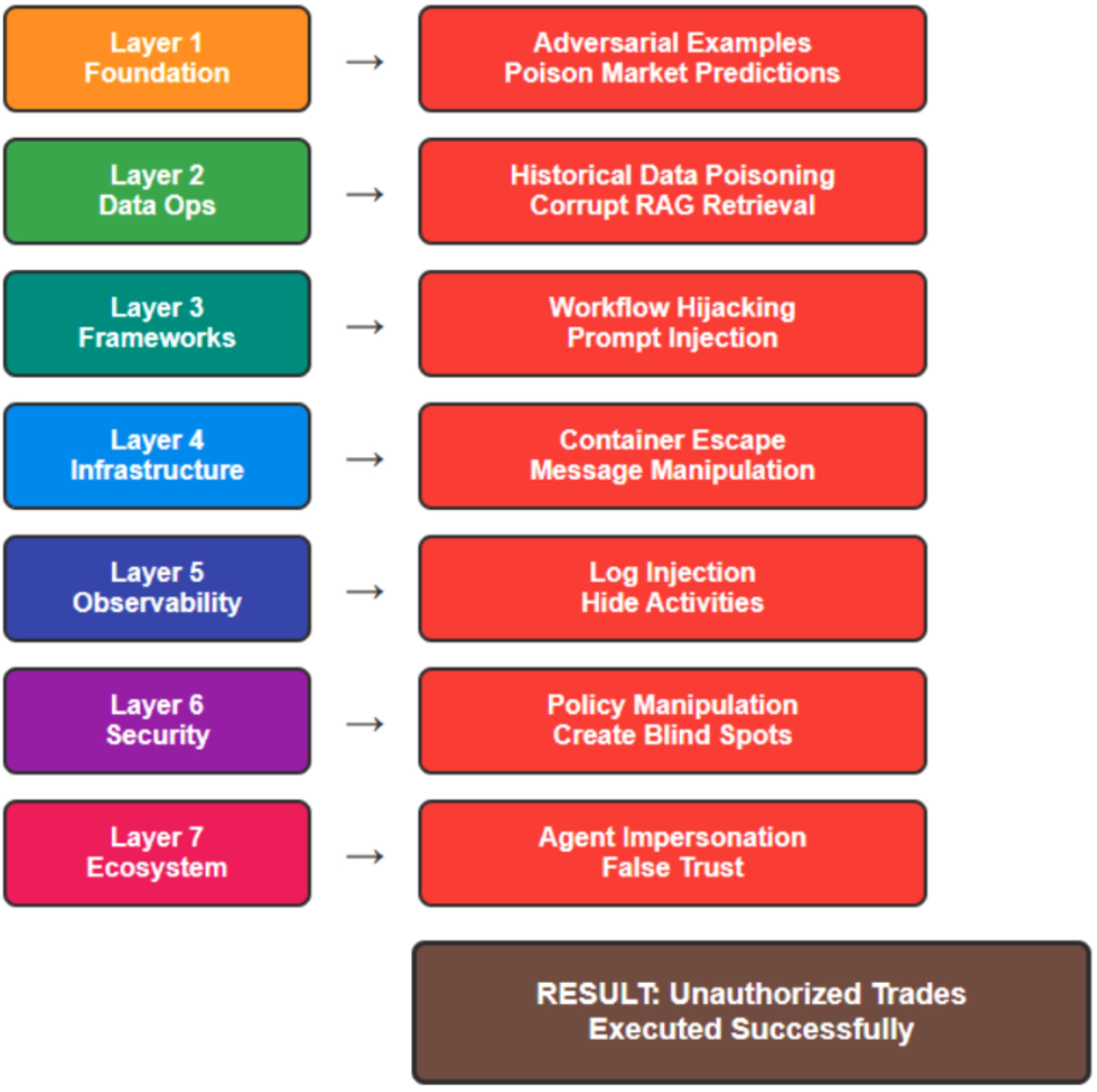 Vertical attack propagation: An attack might begin with data poisoning at Layer 2 (Data Operations), influence decision-making at Layer 3 (Agent Frameworks), and ultimately manifest as unauthorized actions at Layer 7 (Agent Ecosystem).
